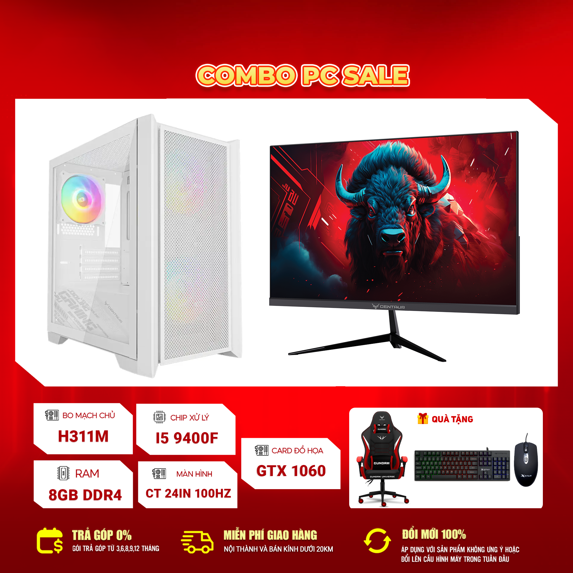 Màn hình: Centaur 24 inch 100Hz – Màn hình tần số quét cao, hình ảnh mượt, góc nhìn rộng, hạn chế mỏi mắt (Bảo hành 36 tháng).