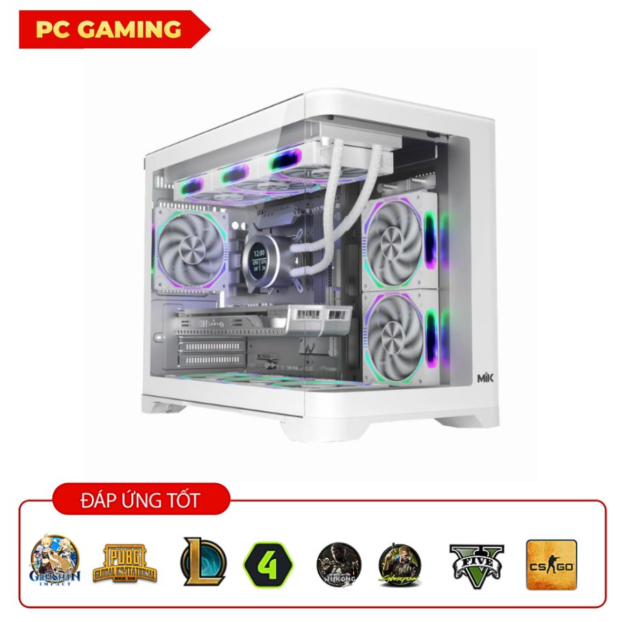 - Vỏ case MIK Focalors M thiết kế tinh tế, gọn gàng với màu trắng sang trọng, đi kèm 6 fan LED tạo hiệu ứng ánh sáng đẹp mắt, làm nổi bật toàn bộ hệ thống.