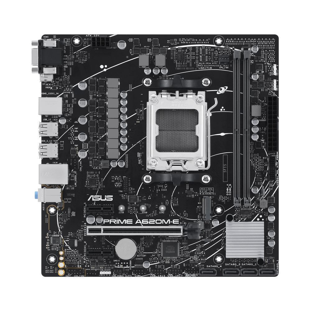ASUS PRIME A620M-E DDR5 sở hữu thiết kế đơn giản, tinh tế và bền bỉ, đặc trưng của dòng PRIME. Tông màu bạc – đen trung tính giúp dễ dàng phối hợp với nhiều loại linh kiện khác nhau. Bo mạch sử dụng PCB 6 lớp và linh kiện chất lượng cao theo tiêu chuẩn ASUS 5X Protection III, đảm bảo độ ổn định và tuổi thọ dài lâu.