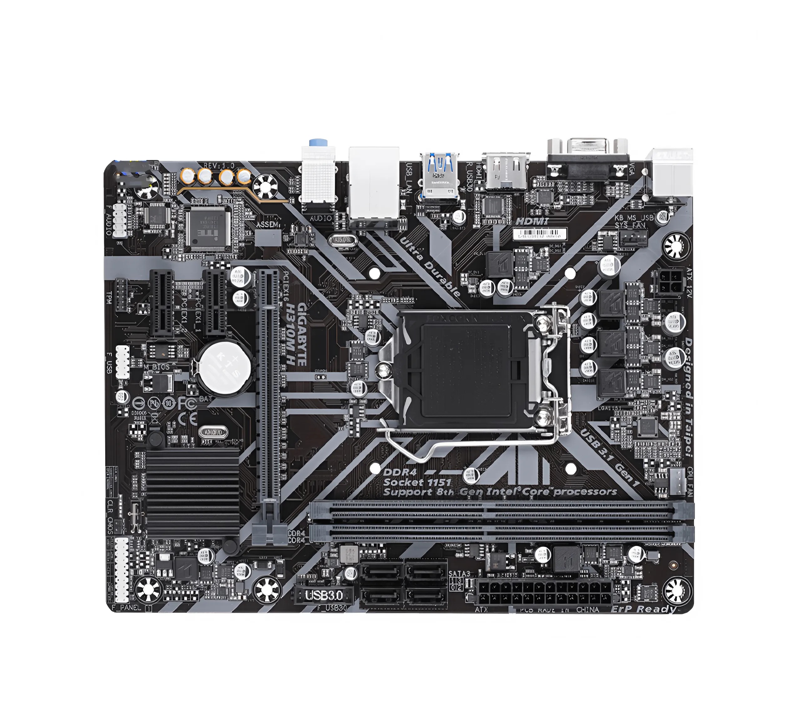 Sử dụng chipset Intel H310, hỗ trợ socket LGA 1151, tương thích với các dòng CPU Intel Core thế hệ 8 và 9. Điều này giúp người dùng có nhiều lựa chọn từ Intel Pentium, Core i3, i5, i7, phù hợp với các nhu cầu từ văn phòng đến gaming cơ bản.