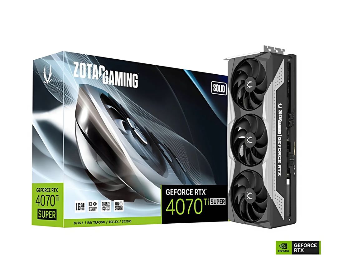 VGA ZOTAC RTX 4070 Ti Super Solid là một trong những mẫu card đồ họa mạnh mẽ nhất trong phân khúc cao cấp, đáp ứng tốt nhu cầu của cả game thủ lẫn nhà sáng tạo nội dung chuyên nghiệp. Với kiến trúc Ada Lovelace, GPU này mang đến hiệu suất vượt trội so với thế hệ trước, cho phép chạy game AAA ở 4K, xử lý đồ họa phức tạp và hỗ trợ công nghệ AI hiện đại. Sở hữu 16GB GDDR6X với băng thông bộ nhớ cao, cùng số nhân CUDA lên đến 8448, RTX 4070 Ti Super Solid đảm bảo tốc độ xử lý nhanh chóng, giúp tăng trải nghiệm chơi game và làm việc mượt mà hơn.