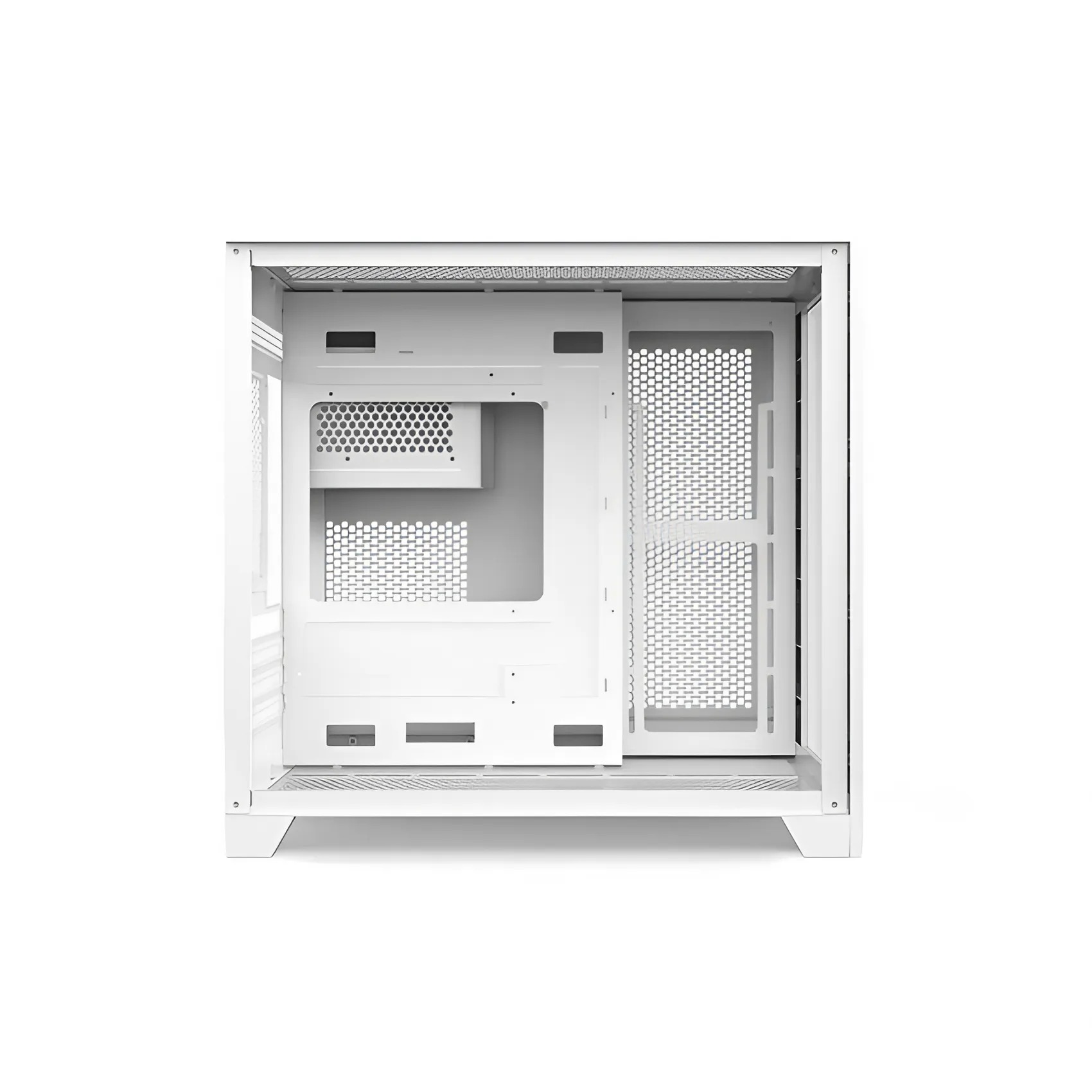 Khung case được làm từ thép SPCC dày dặn, có độ bền cao và được sơn tĩnh điện màu trắng, hạn chế tình trạng trầy xước hay bám bẩn. Kính cường lực hai mặt có độ dày phù hợp, đảm bảo khả năng chịu lực tốt nhưng vẫn nhẹ nhàng, không gây áp lực lên khung máy. Nhờ chất liệu cao cấp, case không chỉ có vẻ ngoài đẹp mắt mà còn giúp bảo vệ linh kiện bên trong khỏi tác động của môi trường bên ngoài.